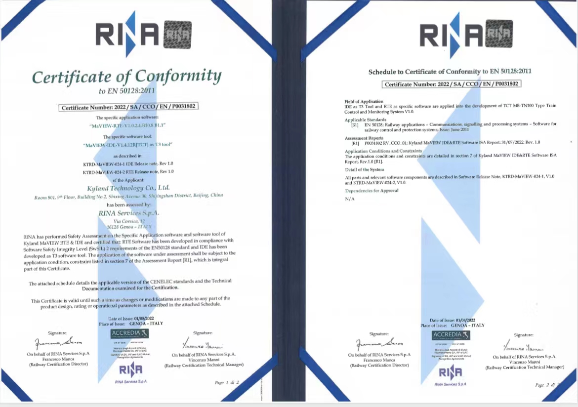 RINA Service S.p.A 于1861年成立,是意大利、瑞士、希腊 NSA(国家安全管理局)授权的独立安全评估机构,是经认证认可机构 ACCREDIA 授权的铁路系统产品认证机构。SIL认证基于IEC61508(GB/T20438),IEC61511(GB/T 21109)等标准,对安全设备的安全完整性等级(SIL)或者性能等级(PL)进行评估和确认的一种第三方评估、验证和认证。功能安全认证主要涉及针对安全设备开发流程的文档管理(FSM)评估,硬件可靠性计算和评估软件评估、环境试验、EMC电磁兼容性测试等内容。