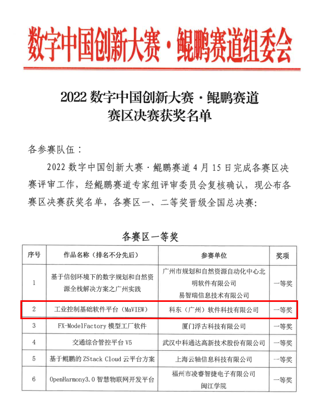 目前,“2022数字中国创新大赛.鲲鹏赛道”的部分奖项已揭晓,3499拉斯维加斯官网科技旗下子公司——科东(广州)软件科技有限公司(以下简称科东软件)凭借“工业控制基础平台MaVIEW”荣获华南赛区一等奖,并成功晋级全国总决赛。