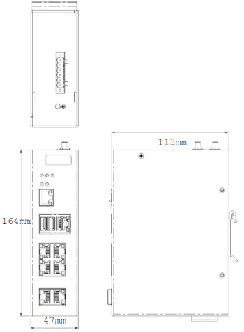 | 机械结构 | 外壳:金属 重量:1.17kg(导轨式); 5.5kg-7kg(机架式) 尺寸(WxHxD): 47mm×164mm×115mm(导轨式) 440mm×44mm×440mm(机架式4GX6GE) 435mm×44mm×360mm(机架式2GX6GE) 440mm×44mm×440mm(机架式4GX14GE) 435mm×44mm×400mm(机架式4GX7GE) IP等级:IP40(导轨式);IP40(机架式) 散热方式:无风扇自然散热 安装方式:导轨安装(导轨式);1U机架安装(机架式) |