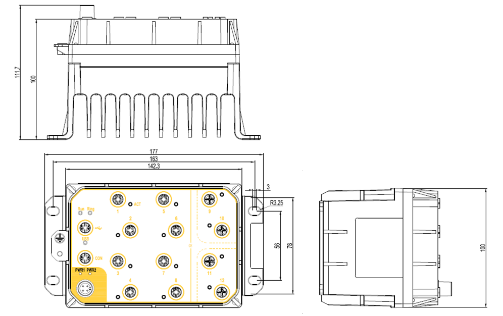 | 机械结构 | 外壳: 金属 散热方式: 自然冷却,无风扇 防护等级: IP65 尺寸: 100mm×177mm×111.7mm(H×W×D)带散热肋 100mm×177mm×73.4mm(H×W×D)不带散热肋 重量: <2Kg 安装方式: 壁挂式 |